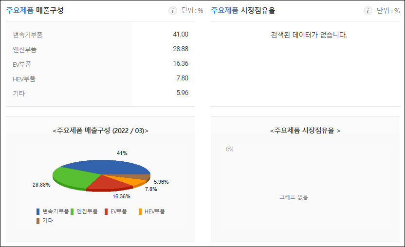 - 매출구성은 변속기부품 41%, 엔진부품 28.88% 등으로 이루어져 있음.