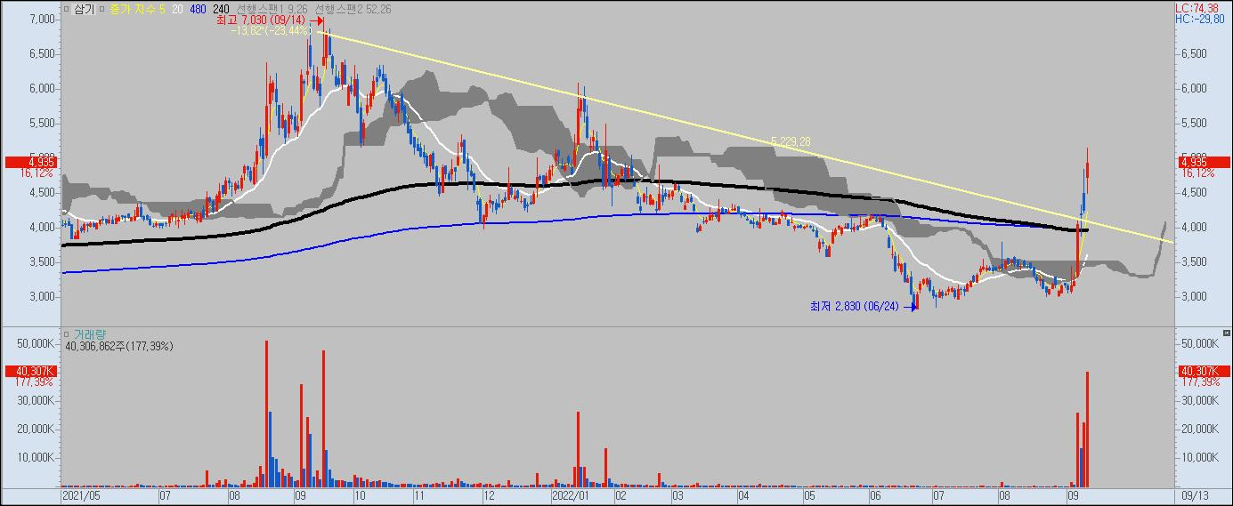| 호재 뉴스 | 2022.09.13 [특징주]삼기, "쏟아지는 전기차 견적 의뢰 감당 어려워"…美 현지 알루미늄 다이캐스팅 ↑ 2022.09.08 [특징주]삼기, 현대차 美전기차 공장 수혜 기대감에 급등 2022.02.23 '엔진부품 강자' 삼기, 전기차 승부수 띄웠다 |